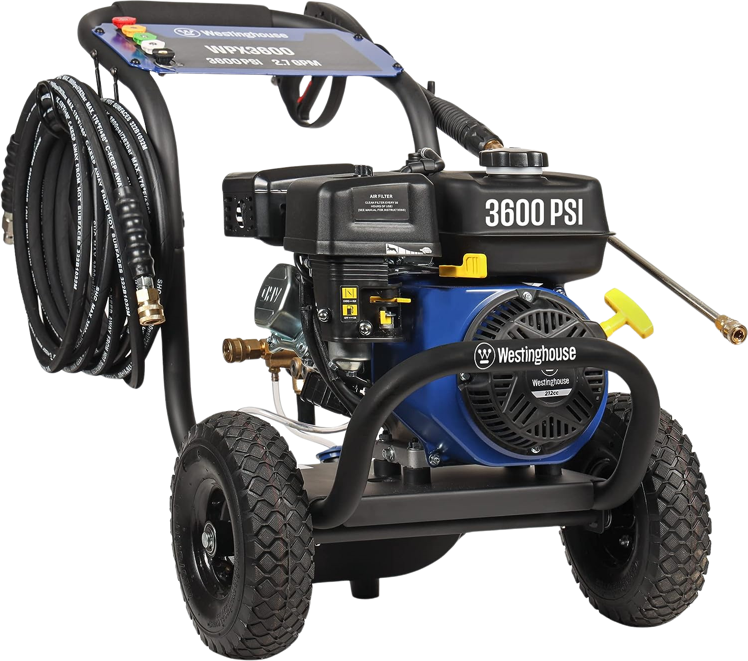 The Westinghouse WPX3600 Gas Powered Pressure Washer, with 3600 PSI and 2.7 GPM, is designed to tackle your toughest cleaning jobs with ease. Built with a powerful 4-cycle OHV Westinghouse Engine and a maintenance free axial cam pump, it’s meant for powerful heavy-duty cleaning. With 5 interchangeable nozzle tips and a built in 3 L soap tank, the WPX3600 has the versatility to handle a variety of situations and surfaces including brick, stone, concrete, wood, aluminum, and iron. The 3.6 L fuel tank and never-flat wheels offer easy mobility and maneuverability.