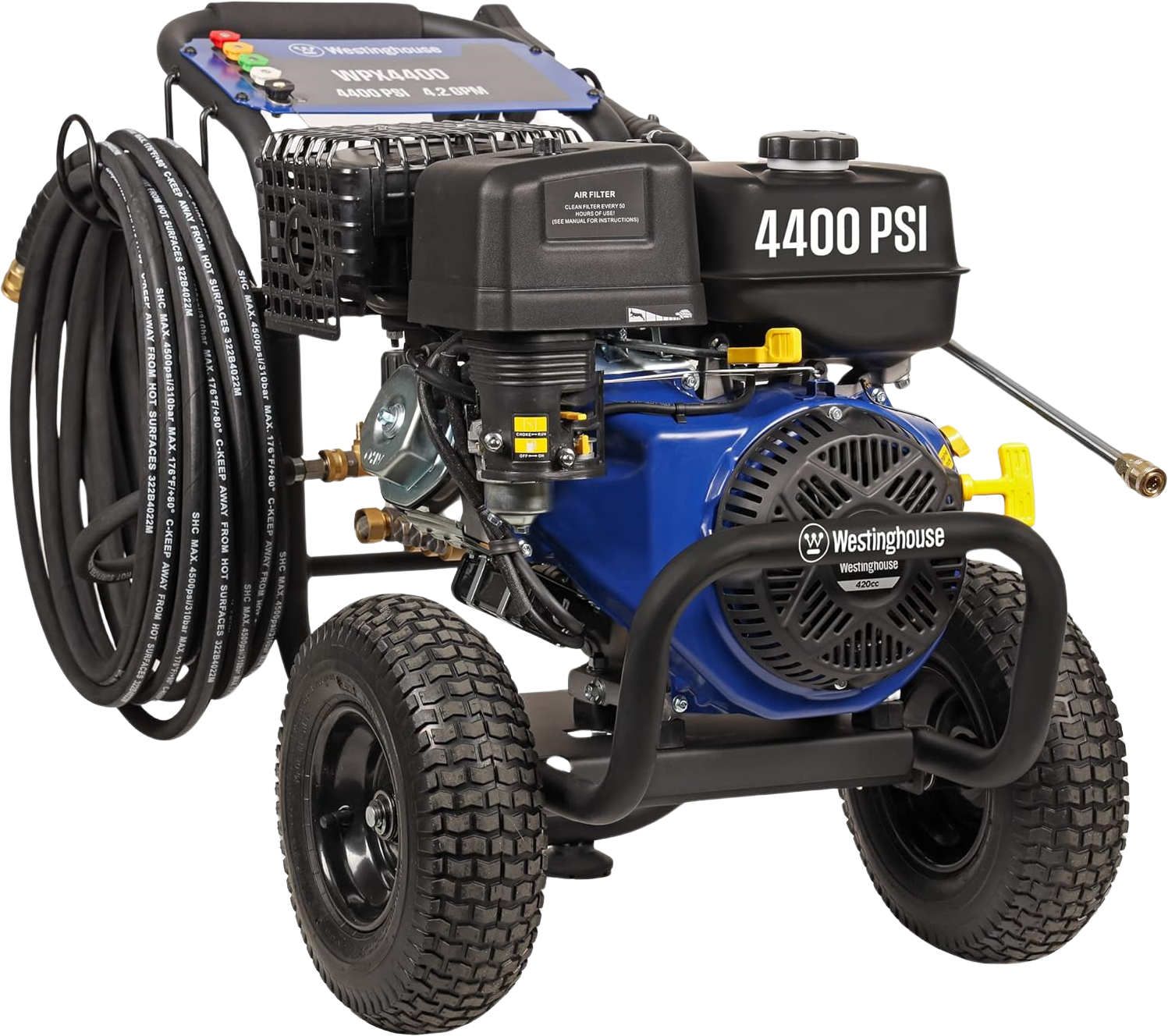 The Westinghouse WPX4400 Gas Powered Pressure Washer, with 4400 PSI and 4.2 GPM, is designed to tackle your toughest cleaning jobs with ease. Built with a powerful 4-cycle OHV Westinghouse Engine and a maintenance free axial cam pump, it’s meant for powerful heavy-duty cleaning. With 5 interchangeable nozzle tips, the WPX4400 has the versatility to handle a variety of situations and surfaces including brick, stone, concrete, wood, aluminum, and iron. The 6.5 L fuel tank and never-flat wheels offer easy mobility and maneuverability.